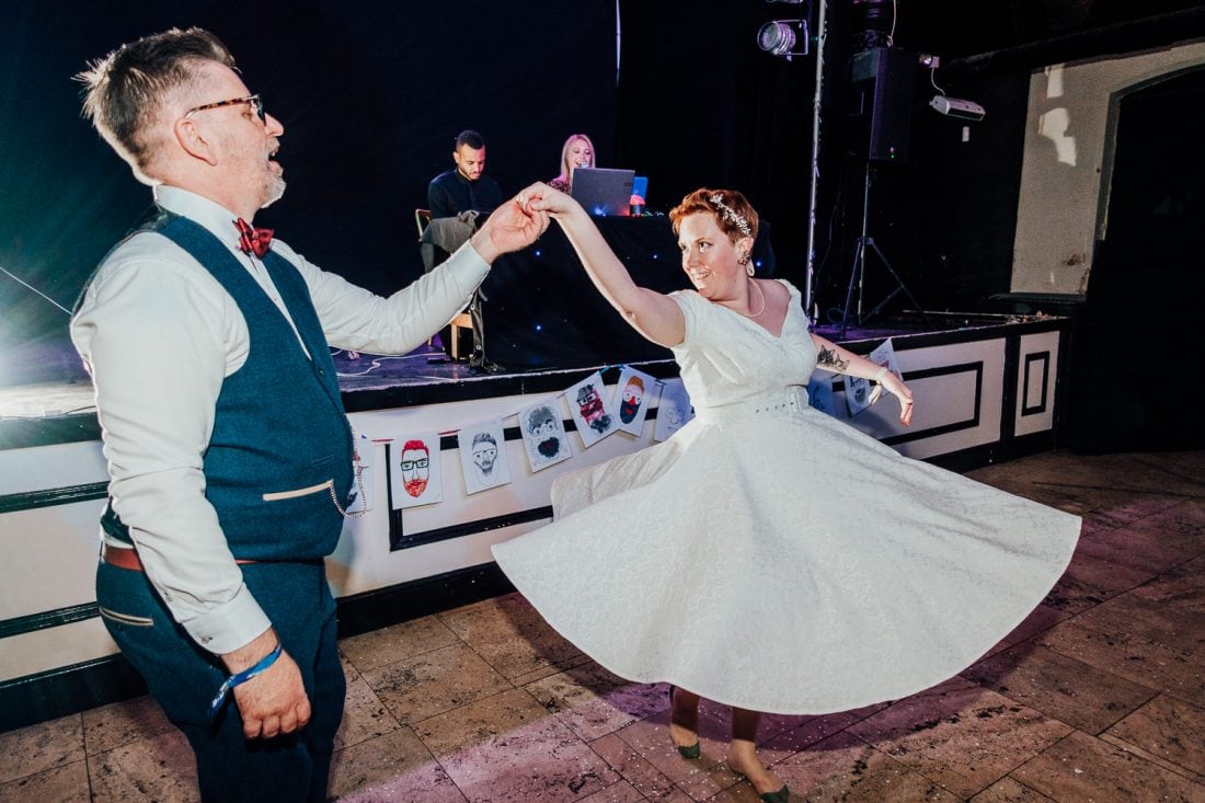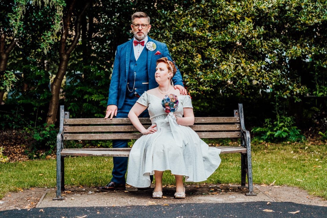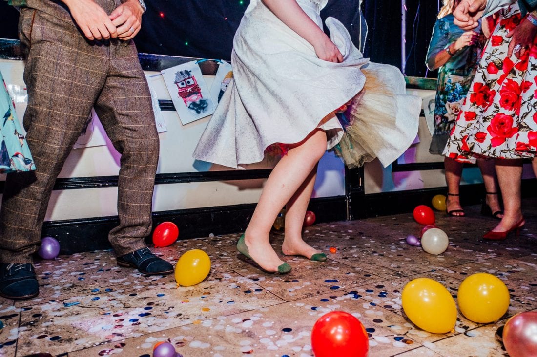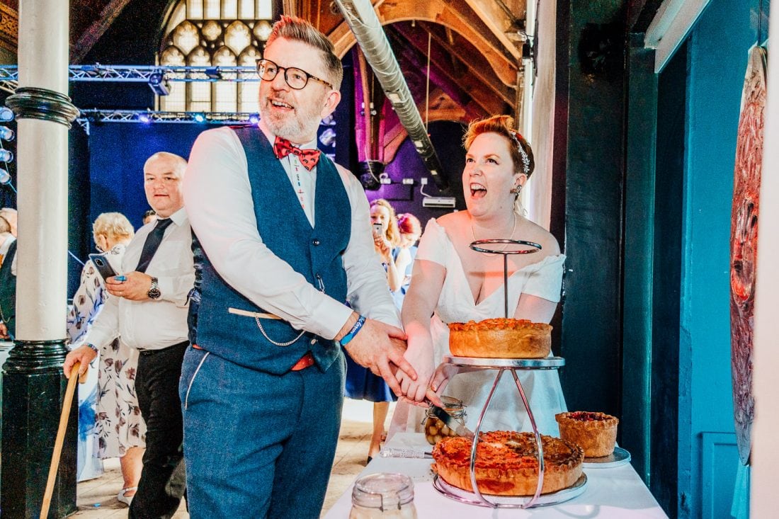 Venue: Diamond // Suit: Marc Darcy // Dress: British Retro // Shoes (groom): Joe Browns // Shoes (bride): Irregular Choice // Pork pie wedding cake: Toppings // Cupcakes: Moor’s Bakery // Flowers: Janice Bassingdale // Bridesmaid dresses: Lindy Bop // Table decorations: Sally and Gary Collings